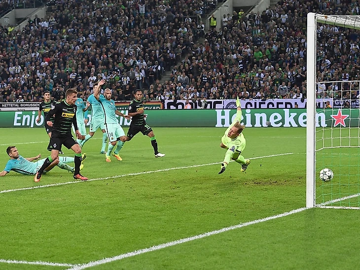 За первые 12 минут могло показаться, что «Барселона» сегодня вышла в черной форме, ведь Гладбах заставлял гостей обороняться. Но дальше игра начала приобретать всем известный оттенок. «Барселона» начала поджимать хозяев, а последние в свою очередь стали надеяться на чудо. А этим чудом оказался Ян Зоммер. Швейцарский голкипер раз за разом спасал свои ворота после ударов Суареза и Ракитича. Однако на 34-й минуте все изменилось. Неожиданная ошибка каталонцев в центре поля привела к тому, что игроки хозяев убежали 3 в 2. Прострел Дауда замкнул Азар.