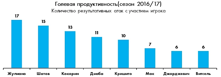 Для нынешнего сезона высочайшая эффективность в завершающей стадии, судя по всему, приобретает характер установившегося тренда, потому как после 12 стартовых поединков она достигла уже 45,8% против 34,2% по итогам сезона прошлого. Разумеется, за всеми этими общекомандными цифрами стоят конкретные исполнители, которым удается сохранять хладнокровие в ключевые моменты игры. В этом отношении особенно выделяется Жулиано, который реализовал 8 из 13 своих моментов (62%), но от бразильца стараются не отставать и Дзюба (4 из 9, 44%) с Кокориным (5 из 11, 45%).
