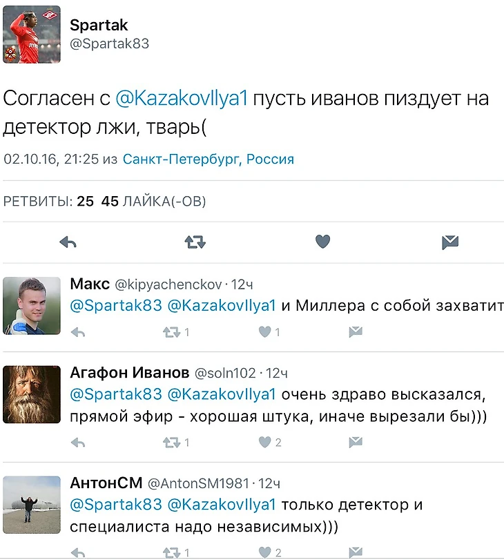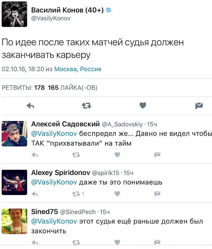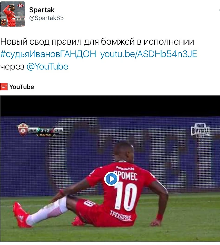 Спорить с тем, что судья и его помощники не справились с давлением, глупо. Однако то безумие, что охватило абсолютно всех после четвертого гола «Зенита», не поддается никакому объяснению. На 85-ой минуте тот самый Кришито сбил Промеса. Как расскажет потом Сергей Иванов, от назначения штрафного его отговорил боковой судья. Но в контратаке Кокорина сбивает Ещенко и привозит второй стопроцентный пенальти в ворота своей команды. И вот тут начинается страшное. Социальные сети на ближайшие несколько часов обрели следующий облик.
