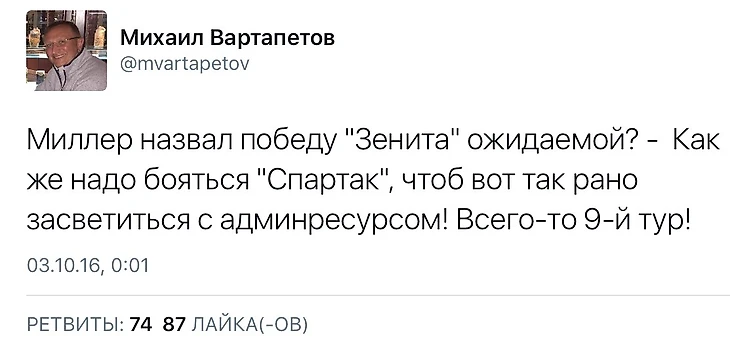 Ну а что творилось в послематчевых интервью и передать-то страшно. Ивелин Попов грозился божьей карой, Денису Глушакову вдруг стало стыдно «за такой чемпионат» (не за свою игру же), генеральный директор «Спартака» Родионов не мог вспомнить более плохого судейства. Олег Иванович Романцев даже финал Лиги чемпионов «Зениту» пророчил с таким-то судейством. И лишь глупенький Массимо Каррера не поддержал всеобщую истерию и говорил об игровых аспектах матча, а не о заговорах против великого «Спартака». Странный человек.