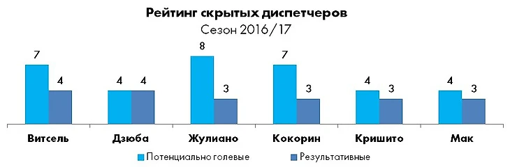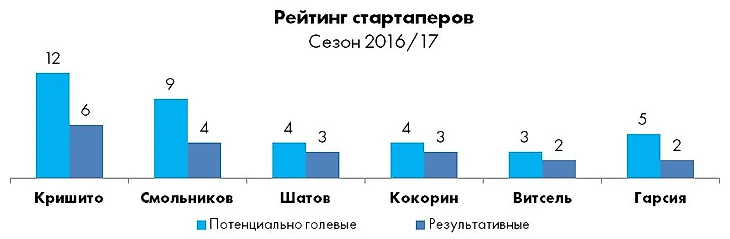 В текущем рейтинге игроков, которые чаще других оказывались в потенциально голевой позиции, компанию пятерке явно атакующих составляет штатный пенальтист Кришито. Помимо лидерства Жулиано, который забивает в среднем каждые 82 минуты своего пребывания на поле (к слову, скорострельность Халка в прошлом сезоне составляла 149 минут), обращает на себя внимание высочайшая эффективность всех зенитовских ударников.
