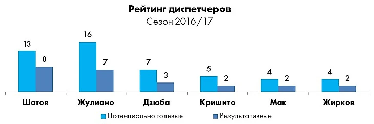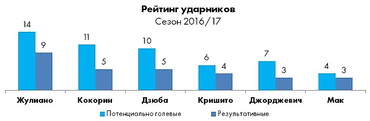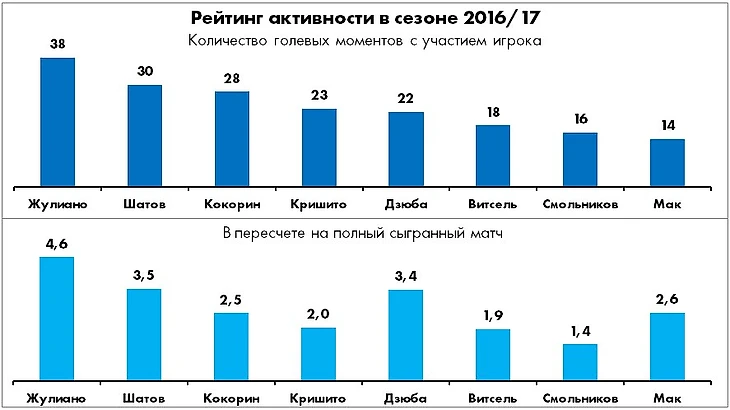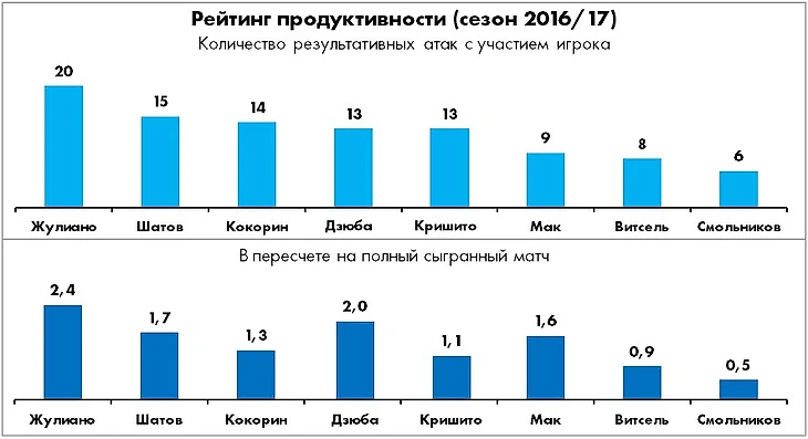 Интересно, что по итогам сезона-2015/16 планку в 1 результативную атаку за матч преодолели лишь трое зенитовцев (Халк, Дзюба и Шатов), тогда как в текущем сезоне таковых уже шестеро.