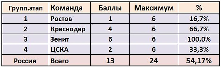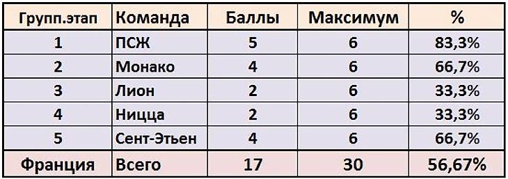 В-третьих, половина наших команд, после половины дистанции, находятся в зоне невыхода из групп, в то время как у Франции в зоне невыхода только Ницца. Таким образом, количество набирающих очки клубов после группового этапа у нас может критически снизиться, что не позволит при любых, даже самых оптимистических раскладах, бороться за пятерку.