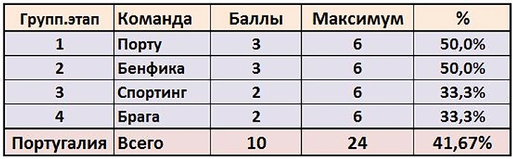 Радует, что к третьему туру, ещё не успели проснуться португальцы. Они набирают пока 42% очков.