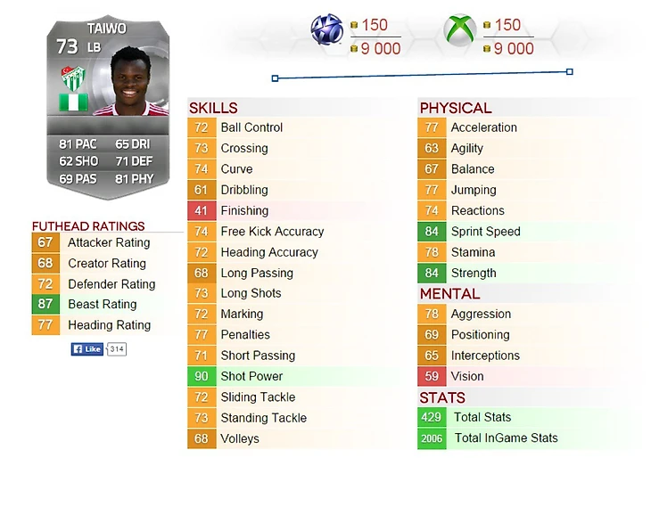 Многие "фиферы" до сих пор помнят про "нигерийскую пушку". В матче с соперником, зачастую, вполне достаточно выполнить несложную схему: довести мяч до штрафной, скатить под удар игроку с высоким показателем силы удара и собственно пробить. Все характеристики можно найти в карточке футболиста. Надо сказать,разработчики на славу потрудились, и Тайе Тайво стал грозным оружием в руках геймеров. По силе удара он не уступал таким мастерам, как: Лукас Подольски и Криштиану Роналду. Остальные показатели в карточке Тайво позволяли "игроманам" на год-два укрепить позицию левого "латераля", если они играли карьеру за команды вроде "Саутгемптона", "Валенсии" или того же условного "Марселя". В режиме Ultimate Team у нигерийца была одна из лучших серебряных карточек среди защитников.