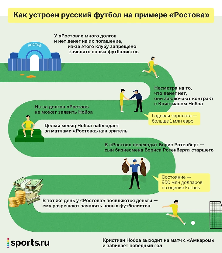 «Динамо» не единственный футбольный клуб, с которым связывали Бориса Ротенберга. Вот что случилось, когда «Ростов» летом 2015 года купил эквадорского полузащитника Кристиана Нобоа. Это любимый игрок тренера Курбана Бердыева, но денег на него у «Ростова» тогда не было.