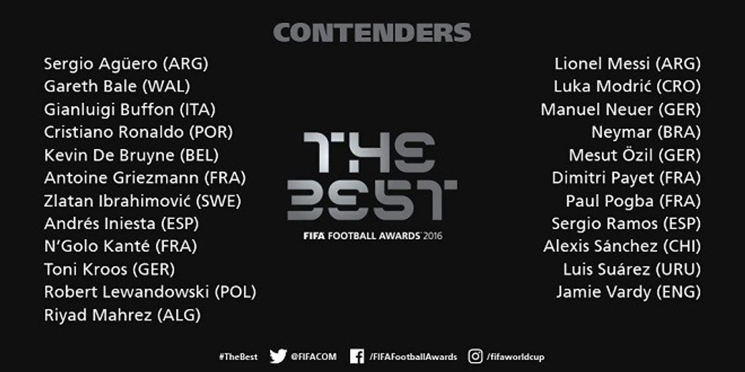 Номинанты ФИФА: Гарет Бэйл, Кевин Де Брёйне, Рияд Марез, Месут Озил, Димитри Пайет, Алексис Санчес, Криштиану Роналду, Луис Суарес, Джейми Варди, Серхио Агуэро, Антуан Гризманн, Златан Ибрагимович, Роберт Левандовски, Лионель Месси, Неймар.
