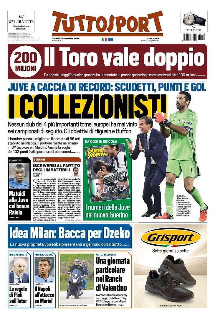 «Юве» в охоте за рекордом: чемпионства, очки и голы. Ни один клуб из 4 наиболее важных европейских турниров никогда не выигрывал шесть чемпионатов подряд. Цели Игуаина и Буффона. Бомбардир ставит на то, чтобы превзойти рекорд в 36 голов, установленный в «Наполи». Вратарь ставит в поле зрения 10-ое Скудетто и… Мальдини. Порог в 102 очка также досягаем для Бьянконери.