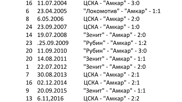 Всего таких матчей было тринадцать – по числу сезонов, проведенных «Амкаром» в РФПЛ (В первой колонке - порядковый номер тура, в котором состоялась игра). Четыре гостевых поединка с победителями предыдущего чемпионата пермяки завершили вничью и один выиграли. Тот матч с «Рубином», сыгранный семь с небольшим лет тому назад, стал одним из самых ярких в истории «Амкара» - соперник рвался еще к одному чемпионству, но был остановлен пермяками, прервавшими победную серию «Рубина» и сильно осложнившими его турнирный путь.