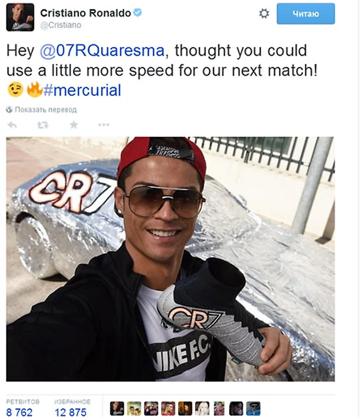 Пару дней назад друзья Роналду Рикардо Регуф и Куарежма напугали звездного футболиста в день презентаций новых бутс от Nike. Тогда Криштиану в твиттере написал: «Безумный день. Я все еще смеюсь. Вы просто убили меня, парни. Респект, но это не конец»