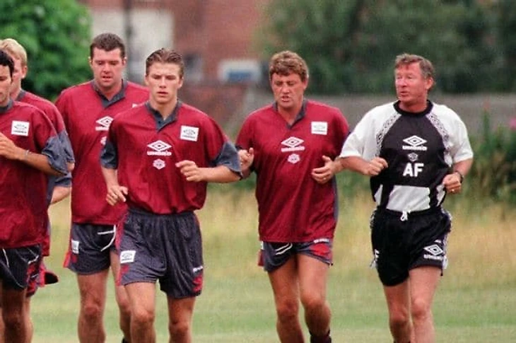 Ферги на предсезонной тренировке вместе с Гари Паллистером (слева), Дэвидом Бекхэмом и Стивом Брюсом.