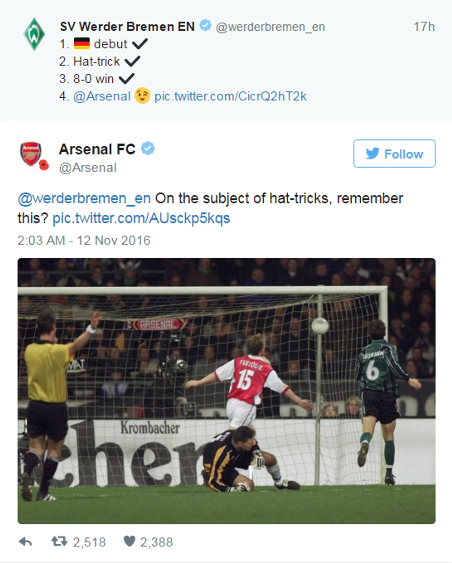 "По поводу хет-триков, помните этот?" На фото Рэй Парлол, оформивший хет-трик в ворота "Вердера" в четвертьфинале Кубка УЕФА 1999/2000. "Арсенал" в двухматчевом противостоянии выиграл со счетом 6:2.
