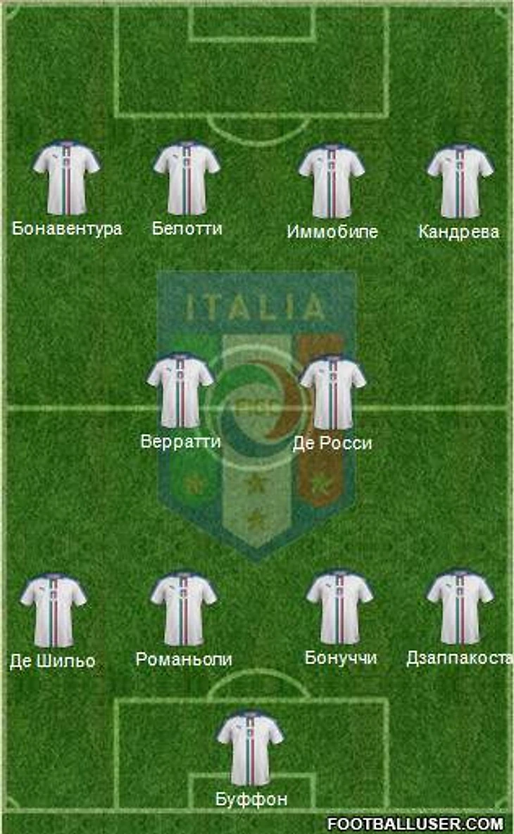 Это – ключевое изменение в построении, ведь в прошлых матчах ставка делалась на вертикальные передачи из глубины от Де Росси или Бонуччи. Да и вместо высокого Пелле с привязанным к нему Эдером, теперь два невысоких бычка Белотти и Иммобиле, требующих абсолютно иного способа доставки мяча. У Пелле, похоже, велики шансы закончить короткую историю своих выступлений за Национале, после конфликта с Вентурой.