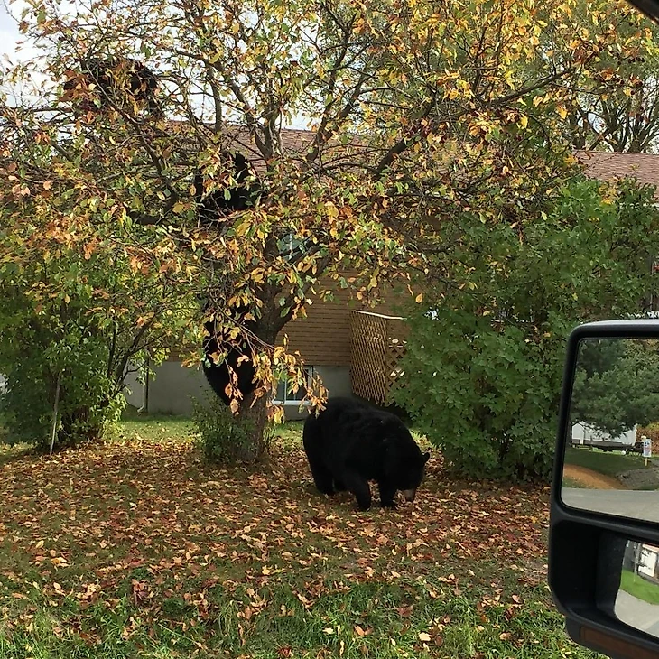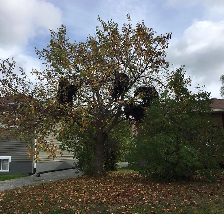 Женщина из города Садбери, находящегося в канадской провинции Онтарио, увидела в своем районе нечто необычное, проезжая мимо соседних домов на машине. Целая семья черных медведей забралась на дерево за яблоками!