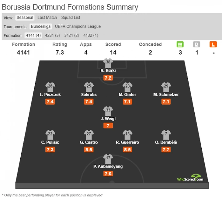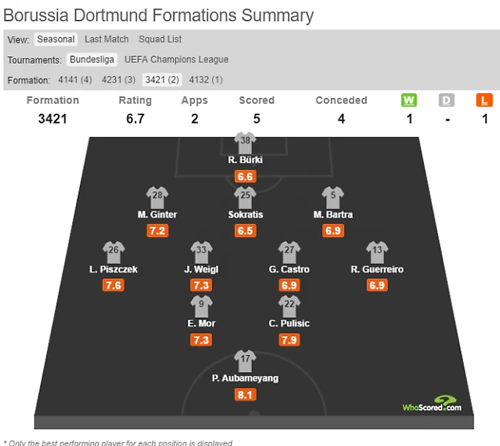 Сейчас тактической гибкостью «Боруссия» похвастаться явно не может. В игре с «Байером» Дембеле и Пулишич, которые занимали не очень привычные позиции латералей, полностью матч провалили и оба получили низкие 6.0 (по версии WhoScored).