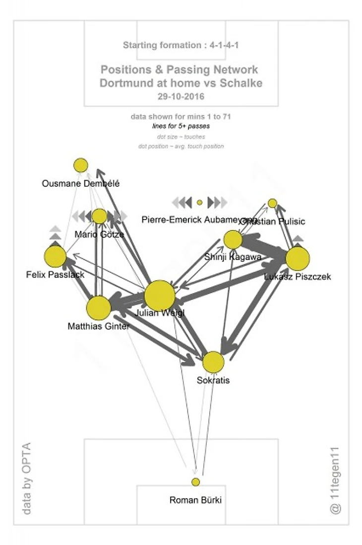 Вообще, в играх с командами, у которых уже есть более-менее стройный рисунок игры и должный уровень организации, «Боруссия» чувствовала себя очень неважно. Показателен в этом плане матч с «Шальке». Столкнувшись с организованной обороной соперника, Дортмунд увяз в центре поля и практически не обострял игру. Самые частые направления передач – во фланги к Пищеку/Пасслаку, а также перепас с центральными защитниками (см. графику).