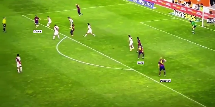 Сразу два центральных полузащитника «Барселоны» (Хави и Ракитич) находятся в штрафной «Райо Вальекано». Конечно, в этом эпизоде команда Пако Хемеса крайне беспечно обороняется (у «Барсы» – численное большинство), но в сборной у Лео крайне редко бывает такое количество предложений в штрафной не после розыгрышей стандартов.