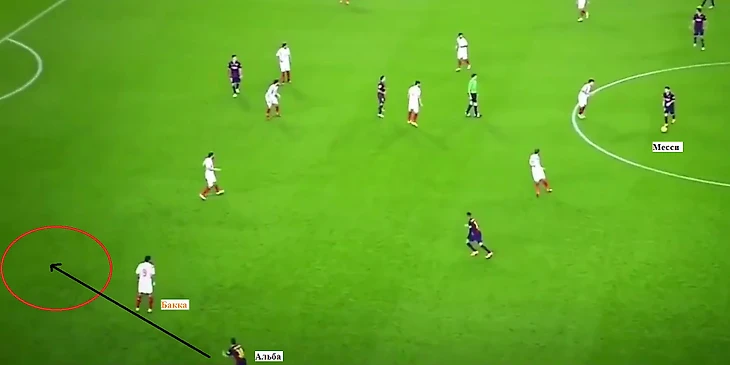 Как только Месси разворачивается лицом влево, Альба начинает движение за спину Бакке. Лео делает верховую передачу в свободную зону, которая доходит до левого защитника «Барсы».