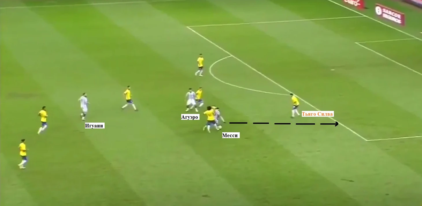 После отбора аргентинцами мяча у Марсело, у Месси, Игуаина и Агуэро появилась возможность убежать втроем против четверых аргентинцев. Конечно, ничего у команды Баусы не вышло, причин этому три. Во-первых, Игуаин, имеющий перед собой пространство между Фернандиньо и Ренато Аугусто, не побежал в свободную зону (Месси при этом логично двигался с мячом к центру, то есть к Фернандиньо). Вместо этого Гонсало просто побежал трусцой, через пару секунд оставшись метров на пять позади Месси. Во-вторых, в этом эпизоде Агуэро почему-то не пошел к центральным защитникам Аргентины, а, наоборот, смещался в зону опорника бразильцев, просто мешая Месси. В-третьих, пятеро аргентинцев, находившихся на бразильской половине поля в момент получения мяча Лео, так и остались наблюдателями эпизода, не стремясь подключаться в атаку.