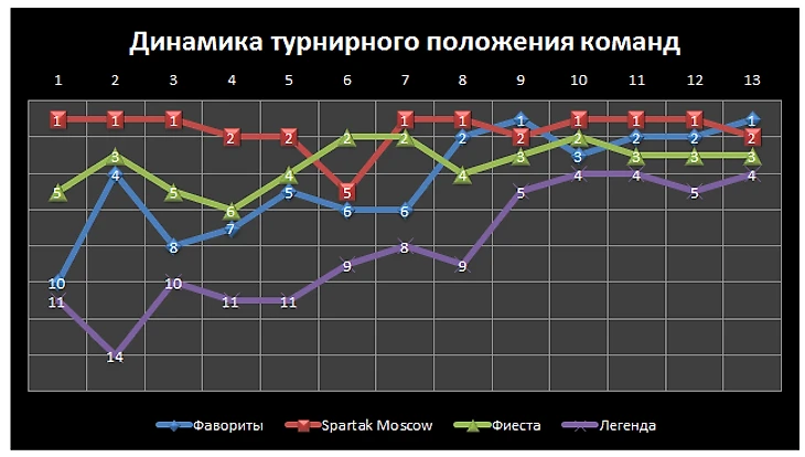 В октябре легендарные решили сильно не напрягаться, показав 8 результат месяца при 6 набранных очках. Однако и этого результата вполне хватило для того, чтобы подняться на 4 строчку. Да и отставание от лидера не выглядит таким пугающим (4 очка), тем более, что в последнем туре перед зимними каникулами Легенду ждет встреча с Фаворитам.