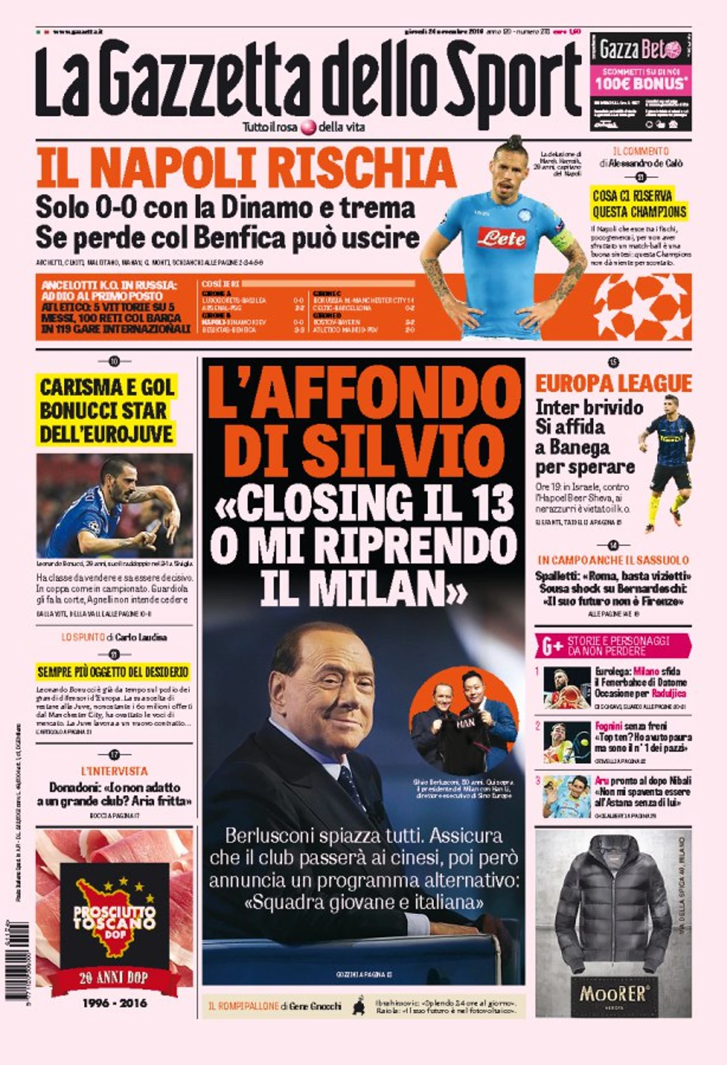 «Вызов в сборную стал сюрпризом». Берлускони, ожидая закрытия сделки с китайцами, посылает сообщения: «Милан», если всё сорвётся, я буду здесь».
