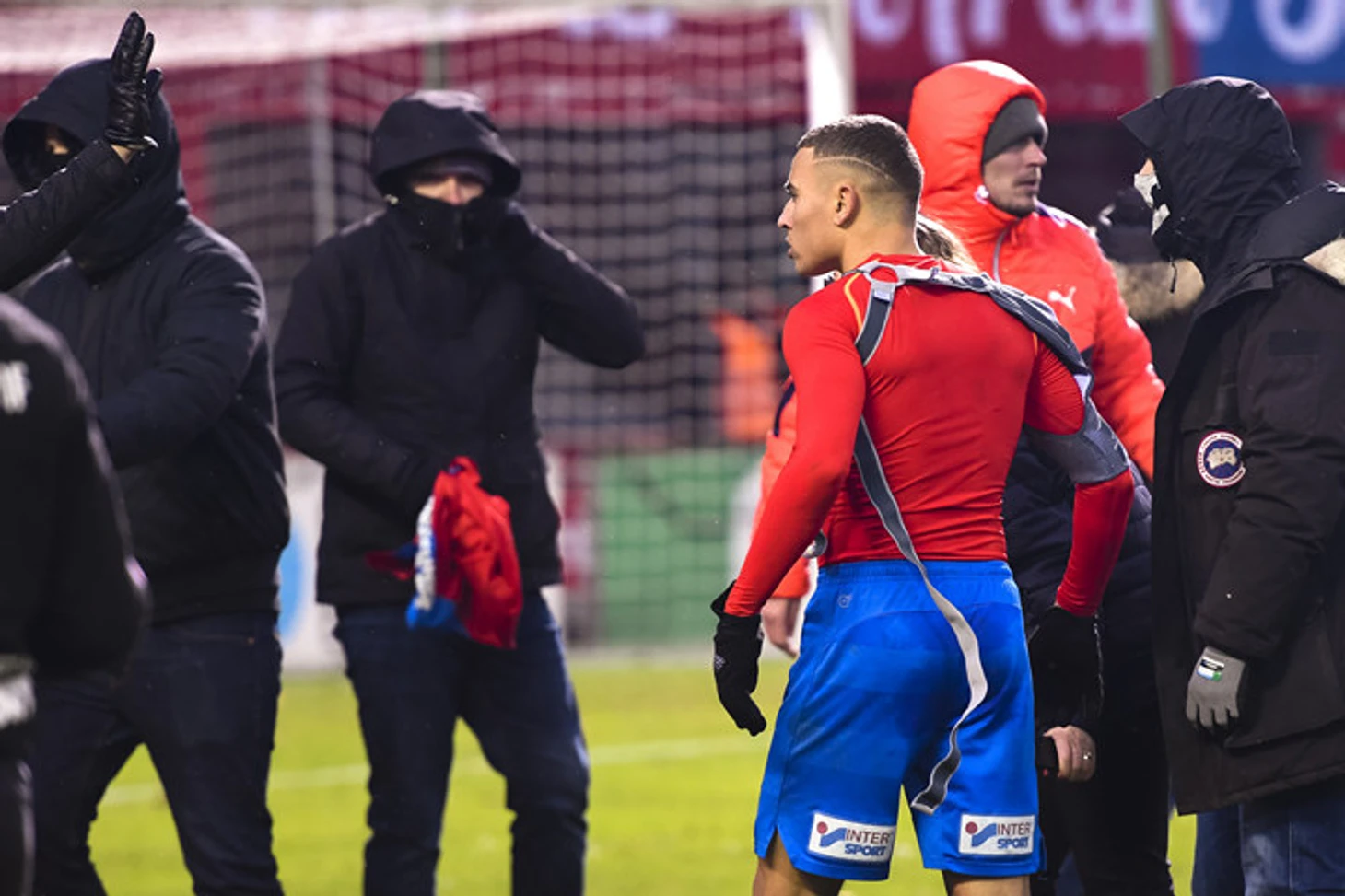 Болельщики выбежали на поле после финального свистка и заставили снять игровую форму Джордана Ларссона.