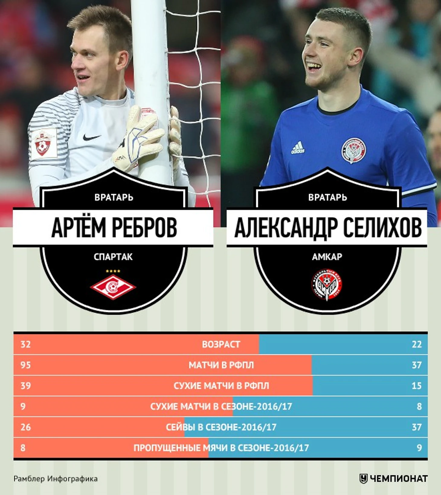 Соответственно вовлечённость Селихова в игру несколько больше, чем Реброва. По сезонным сейвам Александр опережает Артёма со счётом 37-26. Да и процент сухих матчей в РФПЛ от общего количества у Селихова повыше (40,5-37).