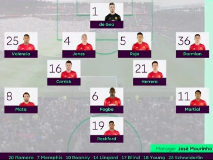 По сравнения с матчем против Суонси в составе Юнайтед произошло четыре изменения: залечивший травму Валенсия вернулся на свою привычную позицию правого защитника, заменив Янга; Эррера отбыл дисквалификацию и заменил Феллайни; Руни уступил место Марсьялю, а Рэшфорд занял позицию перебравшего карточек Ибрагимовича.