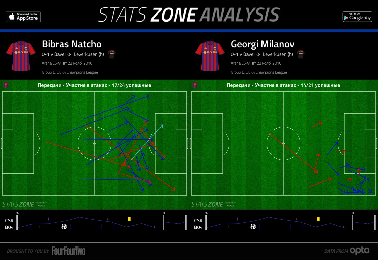 Израильтянин провел лучший матч в этом сезоне, напомнив, почему два года назад его переход в ЦСКА считался большой удачей. Миланов до середины второго тайма был строго привязан к правой бровке, где в целом переигрывал Хенрихса. Впрочем, процент точности передач в заключительной трети у Натхо и Миланова не слишком высокий – 70% и 66% соответственно. У двух самых активных игроков «Байера» (Брандт и Чалханоглу) показатели выше – (85% при 21 передаче у немца, 77% при 22 пасах у турка).