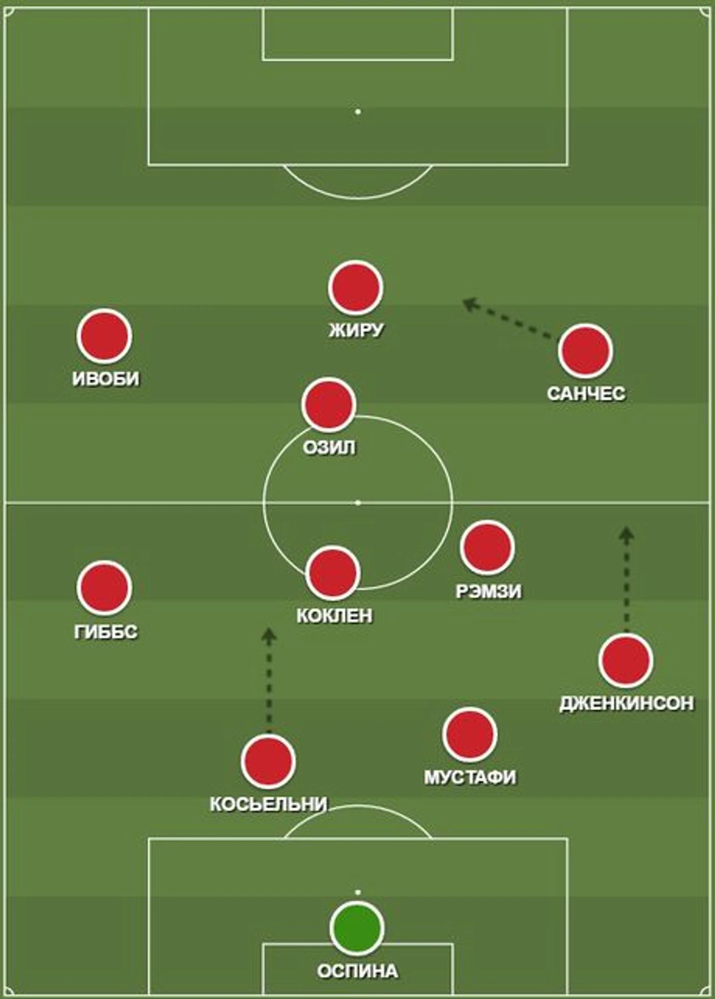 Исходя из этих слов, француз знал силу ПСЖ и приготовил для Эмери свой ответ. Реализовать задумки Венгера должен был атакующий и быстрый состав с расстановкой 4-2-3-1. По составу беспокойство вызывал только правый фланг. Но альтернатив Дженкинсону сейчас нет. Ротация Гиббса и Монреаля, а также игра Оспины в воротах (ему отдана Лига Чемпионов) – логичные решения при сложном календаре. Ставка была сделана на мобильность атаки в лице Ивоби, Озила, Санчеса, а дополнительную мощь обеспечивал Жиру на острие. Для Оливье это был всего лишь второй матч в основе (первый пришёлся на «Лудогорец», 3:2). Опорную связку составили Коклен и Рэмзи. Венгер своим выбором подтверждал свои слова – он планировал действовать с позиции силы.