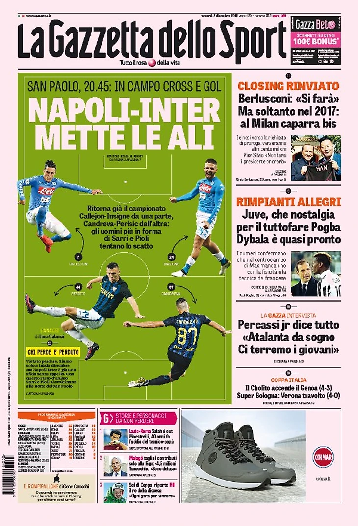 «Сан Паоло», 20:45: на поле кроссы и голы. Чемпионат уже возвращается. Кальехон-Инсинье с одной стороны, Кандрева-Перишич с другой: они – люди в наилучшей форме у Сарри и Пиоли, пробующих перестрелку.