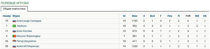 Заметно, что Самедов и Миранчук чаще других участвуют в опасных моментах, а Александр еще и в реализованных. На мой взгляд, это говорит о том, что игроки хорошо вписаны в командную игру. При этом лучшие показатели по голевым и предголевым передачам говорят о том, что в процессе создания голевых моментов их ролью чаще всего является не роль статиста, а наоборот выполнение последних обостряющих действий на чужой трети поля.