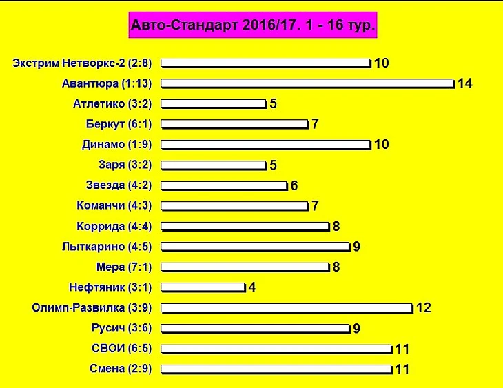 «Авто-Стандарт» не дает скучать ни себе, ни соперникам, ни зрителям. Судите сами: последние 4 тура в матчах с его участием меньше 9 голов не забивается, а общее количество матчей «8+» составляет ровно половину от всех, сыгранных командой (8). Полная статистика количества забитых мячей в матчах с участием «Авто-Стандарта» приведена ниже.