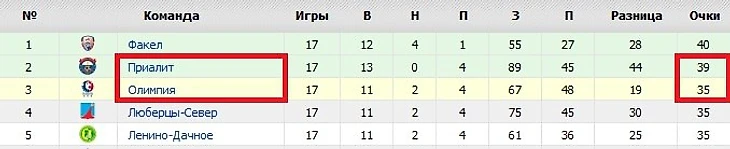 «Приалит» в последних турах немного притормозил, потерпев поражения от «Ленино-Дачное» (1:8) и «Люберцы-Север» (1:3) и, как следствие, пропустил вперед «Факел».