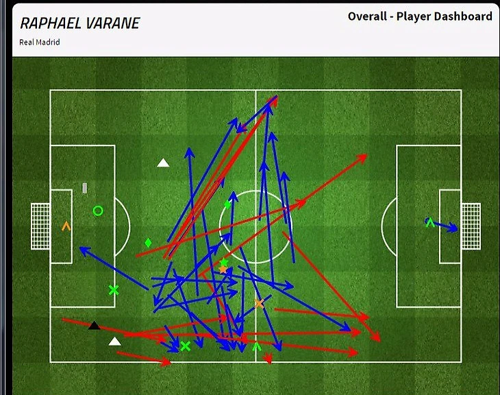 Варан совершил не меньшее количество удачных действий в обороне. Вот только есть одно большое "но". На счету Рафаэля числится фол. Данное нарушение правил на Неймаре в итоге привело к пропущенному голу "Мадрида". В чем ирония? Забивал Суарес именно из-под Варана, который не успел накрыть футболиста во время подачи. Более того, совсем не получалось с передачами. Точность на отметке 68%. Просто для наглядности: