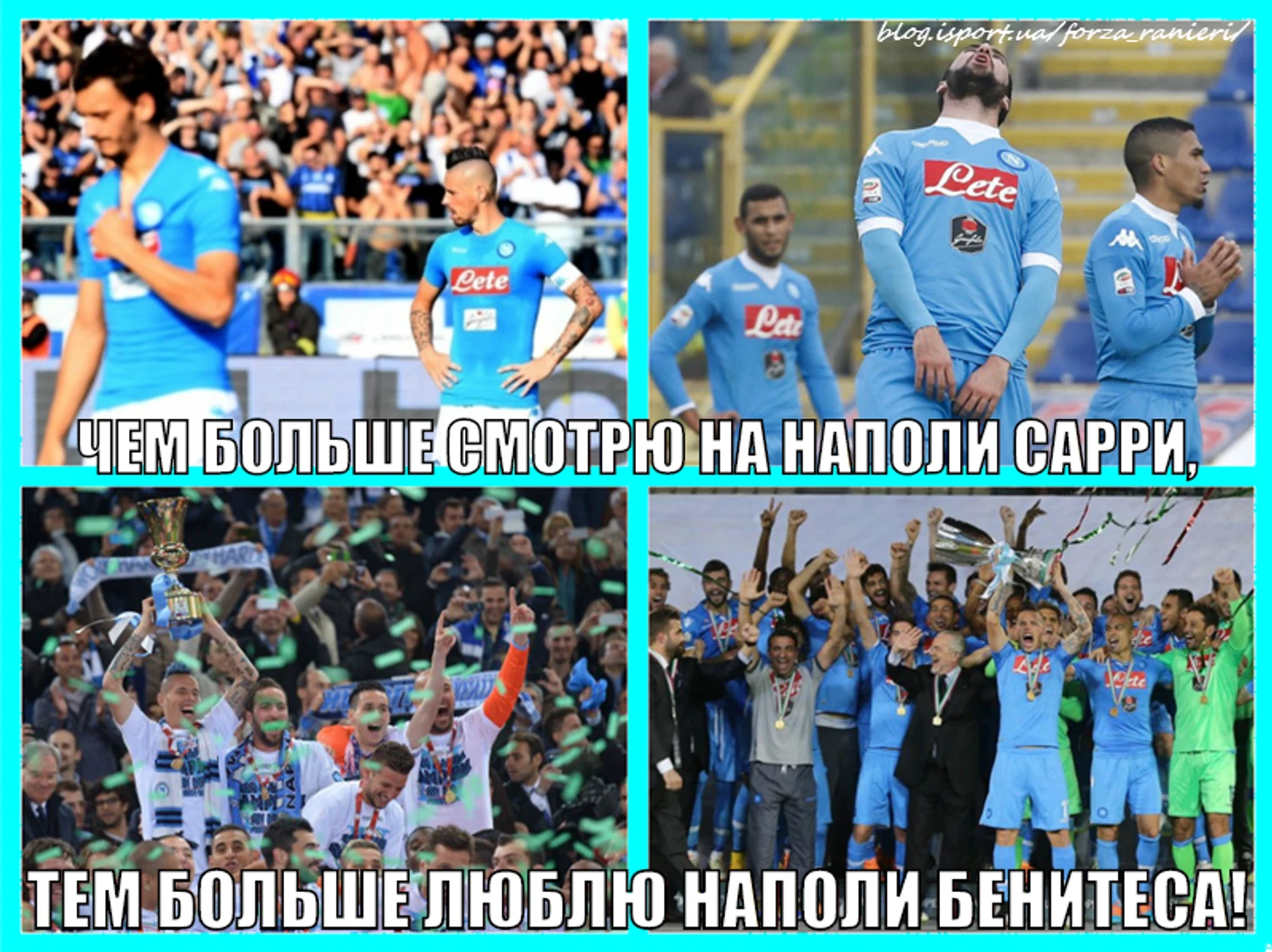 Наконец, результата у Сарри тоже нет: в прошлом сезоне Наполи бездарно, на первых же стадиях вылетел из Лиги Европы и Кубка страны, а в Серии А стал вторым только потому что конкурентов не было, и то, поменяй Рома Гарсию на Спалетти хотя бы на пару недель раньше, не видать было Маурицио и второго места. В этом сезоне Наполи идёт даже за пределами зоны Лиги Европы, а в Лиге чемпионов рискует не выйти из самой лёгкой группы. При Бенитесе команда набирала 12 очков в группе смерти с Арсеналом и Дортмундом, с Сарри имеет 8 очков в суперпроходной группе с Динамо и Бешикташем. Какие ещё нужны доказательства тренерской несостоятельности Сарри?!?!?!
