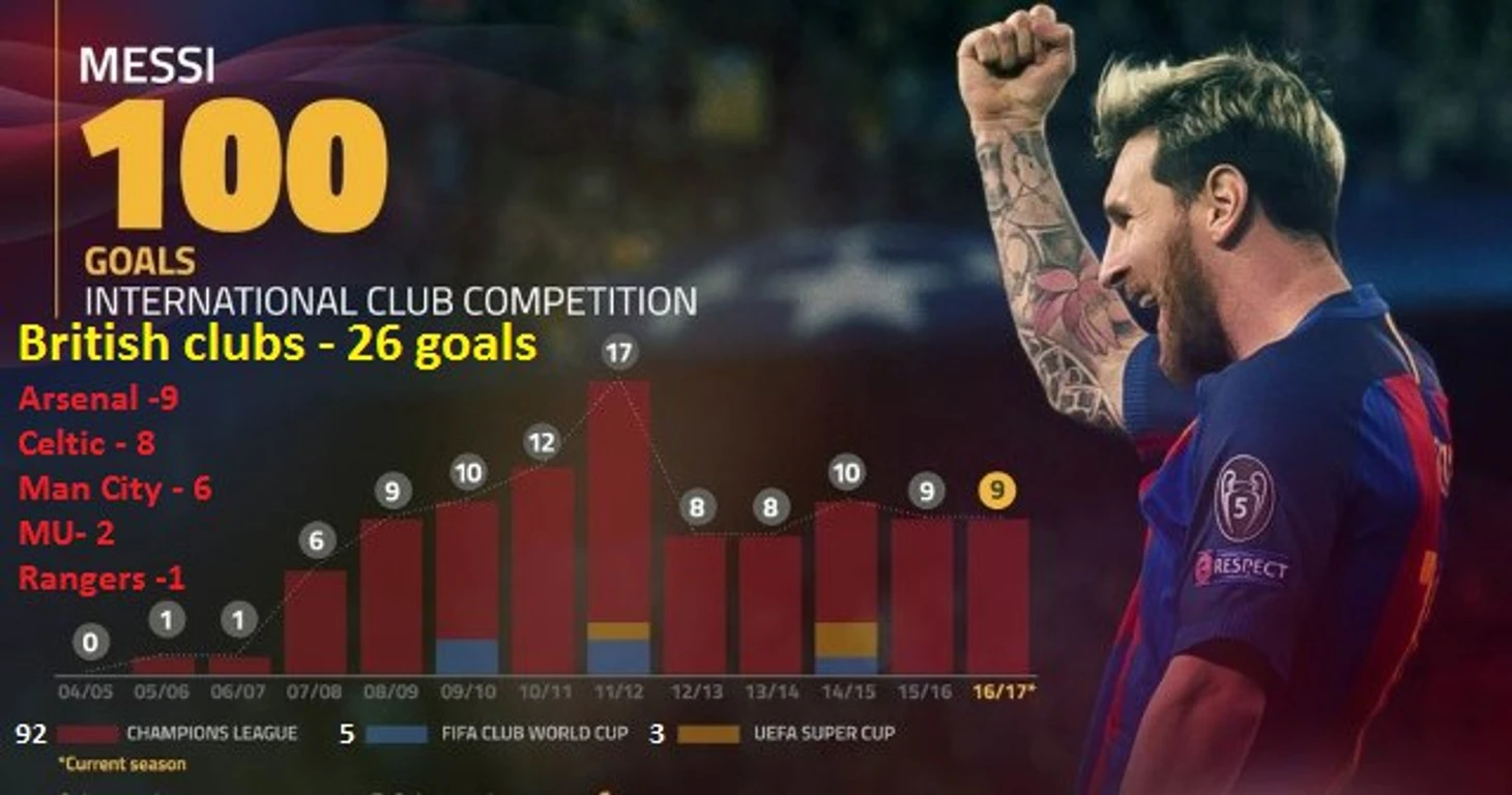 Лионель Месси стал первым футболистом в истории, которому удалось забить 100 голов в международных клубных турнирах. Больше четверти из них влетело в ворота британских команд. И если Вам скажут, что Лео не заиграл бы в Англии, то просто покажите им это фото