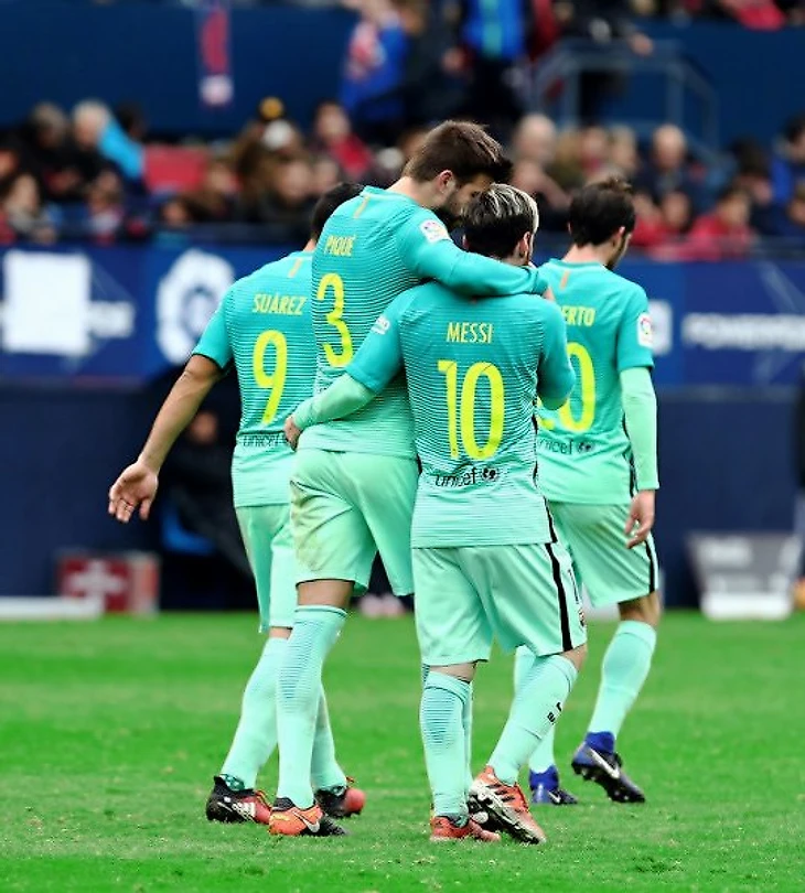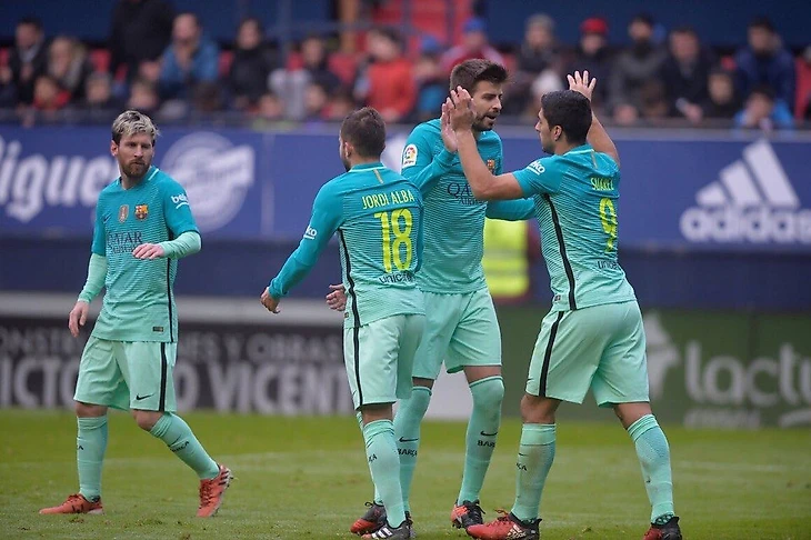 Андрес Иньеста с капитанской повязкой вывел Барселону на газон стадиона "Эль - Садар". Команды сделали предматчевое фото и арбитр дал свисток, матч начался! Осасуна в начале игры действовала довольно смело, и Жерар Пике уже на 2 минуте матча был вынужден в подкате блокировать удар соперника. Позже Барселона взяла инициативу в свои руки. Атаковала, била, контролировала мяч, но все безуспешно, гол в первом тайме забить не удалось. Хотя счет мог быть уже 4:0 , если бы нападающие каталонцев Месси и Суарес реализовали свои моменты. Судья дает свисток и игроки Барселоны с разачарованными лицами уходят на перерыв. По истечении 15 минут, сине-гранатовые были мотивированы победить в этом матче, и во втором тайме показать хорошую игру, ведь отрыв от Реала составляет 6 очков, ошибаться нельзя. Второй тайм начался с атак Осасуны, и ошибок со стороны Барселоны. Таким образом, на 49 минуте перекладина спасает Тер-Штегена от верного гола. Железное правило футбола: не забиваешь ты, забивают тебе. На 59 минуте матча Луис Суарес забивает гол и выводит свою команду вперед, 1:0. Этот гол придает уверенности игрокам Барселоны, и они показывают хороший футбол в оставшееся время 2 тайма. На 72 минуте,Лионель Месси забивает второй гол в ворота Осасуны. И в самой концовке матча,в добавленное арбитром время, 10 номер Барселоны делает дубль и доводит счет до разкромного - 3:0. На этом поединок заканчивается, Барселона зарабатывает свои 3 очка.