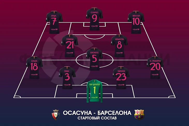 Игру Барселоны можно разделить на 2 части, до 59 минуты и после. В первом тайме было упущено много шансов забить, было множество не точных передач, потерь. В начале второго, Осасуна поджала Барселону и на 49 минуте угодила в перекладину. Тер Штеген был полностью отыгран, и ничего поделать не мог. Повезло. Если бы мяч залетел в ворота, а не попал в каркас ворот, игра могла сложится другим образом. Осасуна бы вела 1:0, и могла сесть в автобус до конца матча. Но этого не произошло, и после забитого гола, мы увидели уверенную, полностью контролирующию ситуацию Барселону. Которая хорошо держала мяч, реализовывала моменты, действовала интенсивно, и полностью переиграла Осасуну по всем аспектам игры.