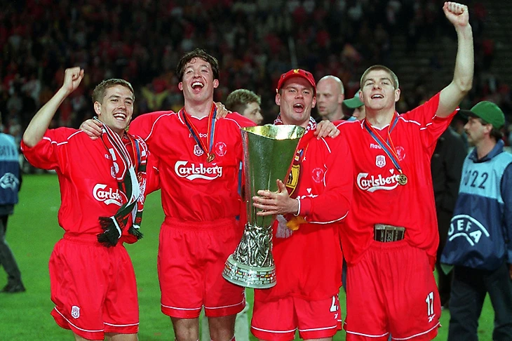 На фото: Майкл Оуэн, Робби Фаулер, Джейми Каррагер и Стивен Джеррард празднуют свою победу в Кубке УЕФА 2000/2001