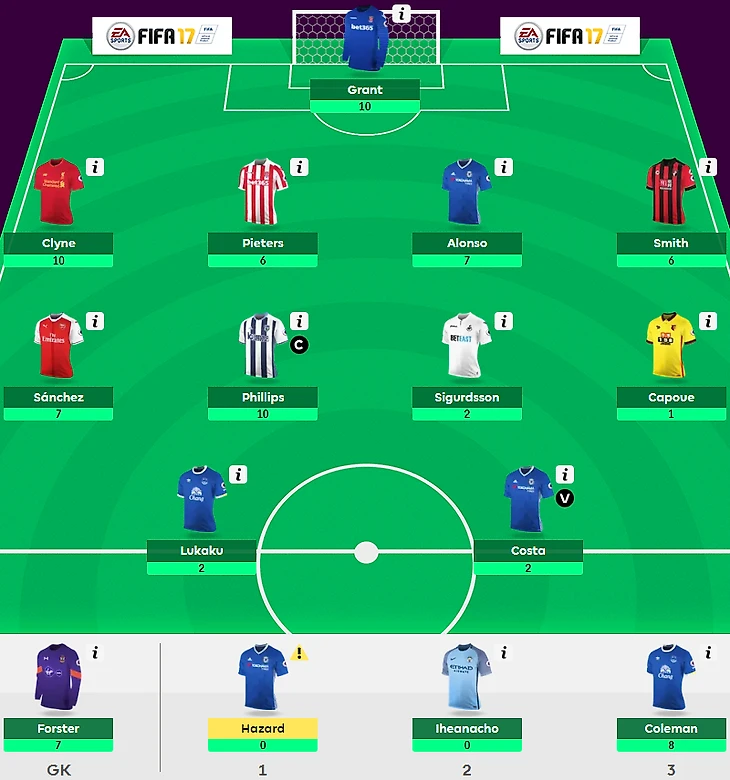 Тут очень много интересного. Во-первых, отмечаем достойный набор голкиперов, где Грант набрал 10 очков (сэйвы+бонусы), а Форстер — 7. Дальше узнаем, что изначально менеджер сделал ставку на Азара и Ихеаначо, но они не сыграли, и вместо них появились играющий в out of position Адам Смит и Капу. 7 очков — неплохо. Отмечаем неожиданное решение поверить в оборону «Стока», которое принесло менеджеру 16 очков, а также рисковое капитанство Мэтта Филлипса из «Вест Брома». Риск оправдался лишь отчасти, но за смелость — однозначный респект. Клайн и Алонсо — добротные пики под грифом «до конца сезона». Оба сыграли в 16-м туре. Лукаку и Коста решили передохнуть, простим им минутную слабость. Сигурдссон и так сделал в этом сезоне слишком много, чтобы расстраиваться из-за одного тура без результативных действий.В общем, хорошая команда, интересные решения и заслуженное лидерство.