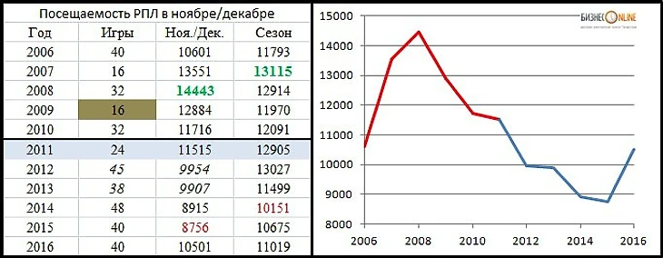 Пять лет назад чемпион России по футбол стал определяться не в ноябре, а мае, что привело к трансформации футбольного календаря. Матчи чемпионата стали играться до поздней осени и начала зимы, что заметно сказалось на посещаемости стадионов. Спортивная редакция «БИЗНЕС Online» проанализировала посещаемость ноябрьских и декабрьских матчей РФПЛ в период с 2006 по нынешний сезоны, а также установила некоторые закономерности и выводы.