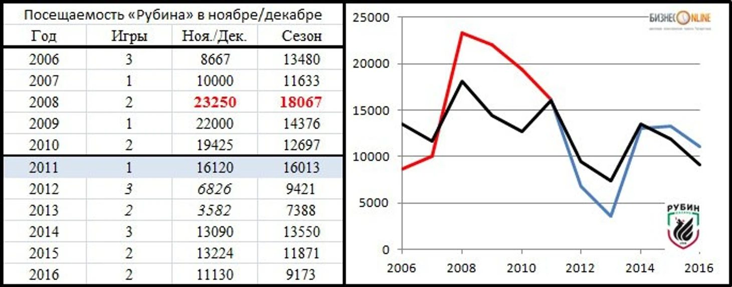 Вот таблица и график посещаемости нашего казанского «Рубина». Красноречивое свидетельство того, как неграмотный подход к работе с болельщиком (смена эмблемы, постоянные склоки и изменения курсов развития) может разрушить все то, что строилось годами. Средняя посещаемость ноябрьских матчей в 23 тысячи человек? Это просто космос для нашей лиги, хотя стоит признать, что это были всего два матча, да и те – чемпионские.