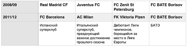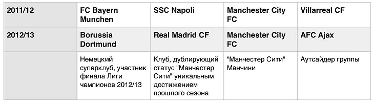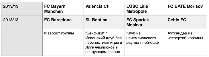 "Бавария" и "Реал" поучаствовали вместе в унижении "Манчестер Сити", а "Бавария" и "Барселона" выступили в роли равнодушных фаворитов в разборках небольших клубов. Настолько равнодушных, что больше запомнились поражениями от представителей "пути чемпионов" Платини - "Селтик" и БАТЭ добились исторических для себя побед. Если "Марсель" и ЦСКА отметились как аутсайдеры в "группах смерти" с участием английских, немецких и итальянских клубов, "Лилль" и "Спартак" не сдюжили с куда более скромным окружением, тоже уступив чемпионам Шотландии и Белоруссии.