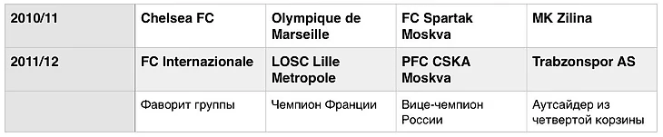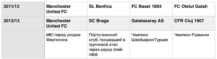 Высокомерность Ферги и неопытность его новой партии "птенцов" обошлась "Манчестер Юнайтед" феерическим провалом, но на следующий сезон в идентичной группе без представителей топ-чемпионатов манкунианцы уже не шутили и обеспечили себе первое место уже после четырех туров. Вместо "Бенфики" зашла "Брага" и провалилась по всем статьям, ЧФР сменил "Оцелул" и уступил второе место в группе "Галатасараю" только по личным встречам.