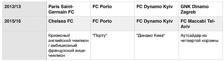 О связи "дебютанта" ПСЖ с сошедшим с ума "Челси" я уже говорил в прошлом материале - успевший побывать в Лиге 2 со времен последнего участия в Лиге чемпионов "Монако" и не менее кризисный "Манчестер Юнайтед", тоже получили одинаковое по сложности для себя испытание. "Динамо Киев" оказался неспособен конкурировать с "Порту" в 2012-м году, но вернулся в Лигу чемпионов спустя три сезона чтобы взять прямой реванш.