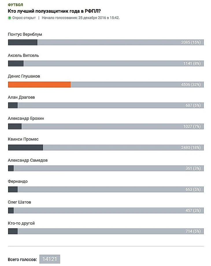 — По моему мнению, Денис Глушаков – лучший полузащитник в российском чемпионате по итогам 2016 года. Он существенно прибавил в начале нового сезона, стал не только капитаном, но и лидером «Спартака». Забил много решающих мячей в важнейших играх. Лучший полузащитник и лидер клуба, занимающего первое место в чемпионате – лучший во всём чемпионате. Всё логично.