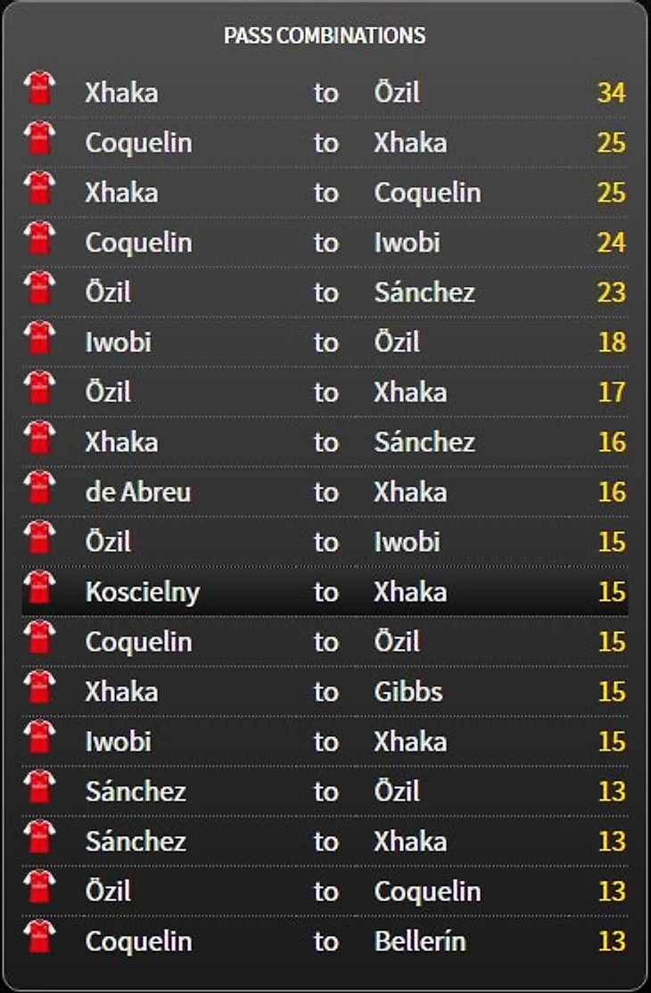 Справедливости ради, Гранит пасовал не только Месуту, он полностью дирижировал атаками из глубины. Сколько раз вы увидели фамилию албанского швейцарца на рисунке ниже?