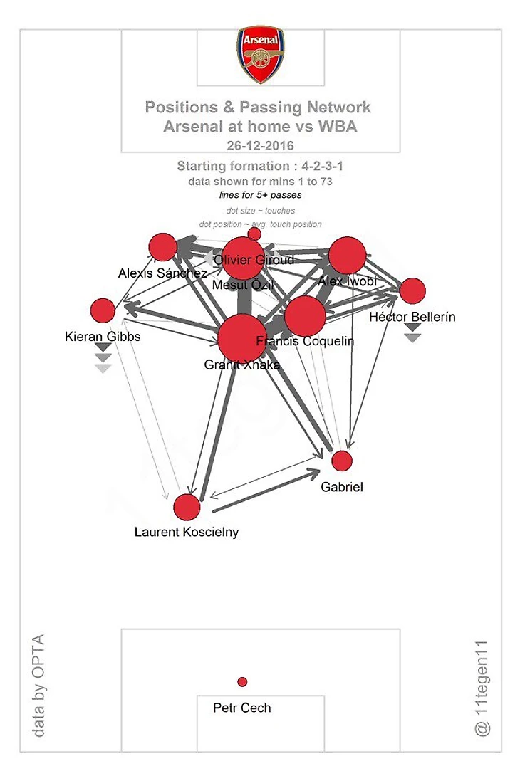 Отдельные слова хотел бы посвятить взаимодействию Гранита Джаки с Месутом Озилом. Все таки отсутствие Санти в составе потихоньку нивелируется. Немецкий турок уже был не так незаметен как в прошедших двух турах. Да и вся команда явно прибавила во втором тайме, что пропорционально противоположно ситуациям в которых оказывались пушкари на Гудисоне и Иттихаде. А Джака из 142 передач 34 отдал на Озила. Что наглядно приведено в рисунке ниже.