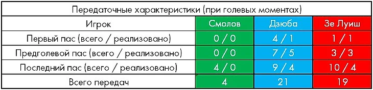В этом чемпионате на счету Смолова нет ни одного голевого паса (в официальной статистике один диспетчерский балл ему все-таки начислили в матче с «Ростовом», но по факту в том эпизоде после удара Федора последовало результативное добивание Налдо – т.е. это результативное действие, но никак не передача) при 4 потенциально голевых, но не использованных партнерами, в то время как его оппоненты в роли ассистентов (причем, что важно, на разных стадиях атаки!) отмечаются с завидной регулярностью.